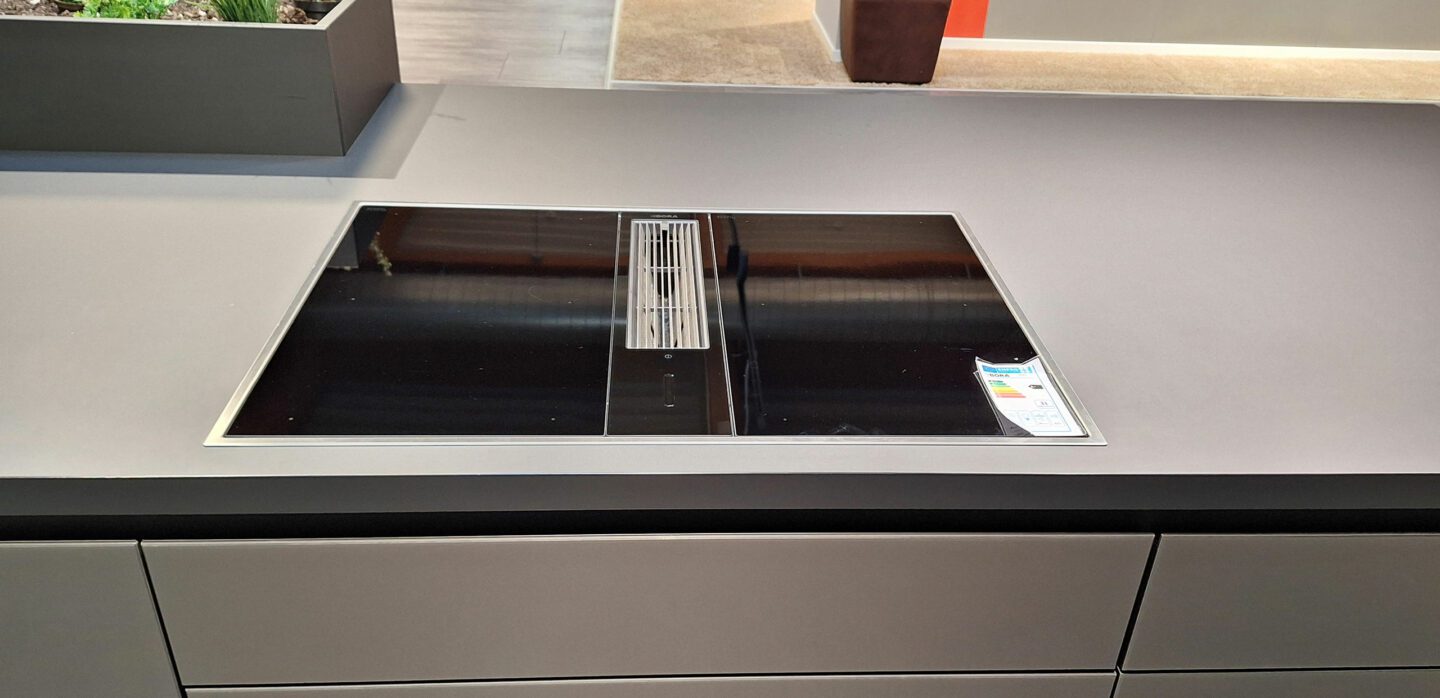 Ausstellungsküche in Insel-Form mit Fronten aus Organic Glas und Mattlack. Weitere Bestandteile dieser Küche sind: