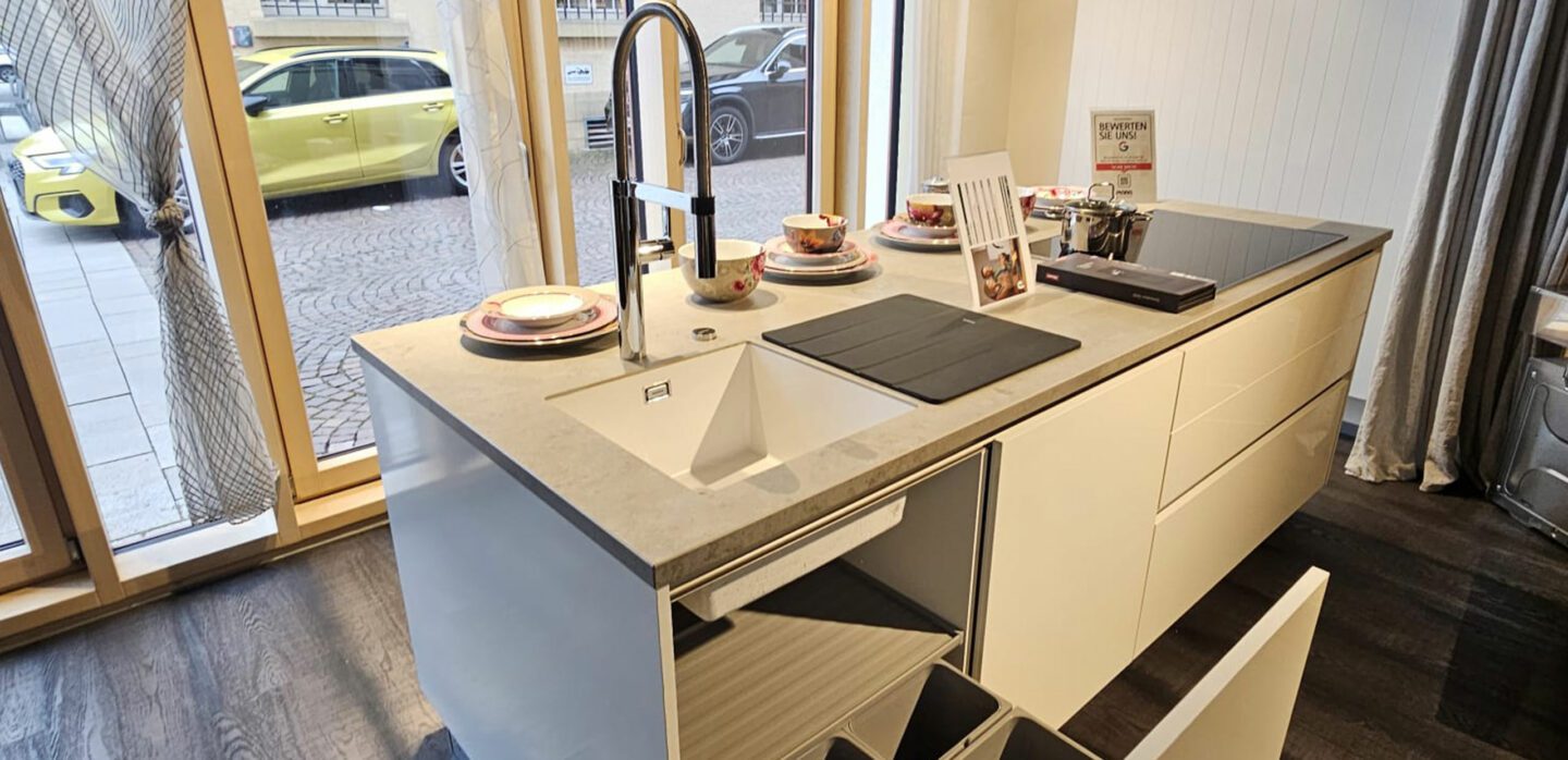 Inselküche mit Keramik-Arbeitsplatte, Spüle, Armatur und Abfallsammler.