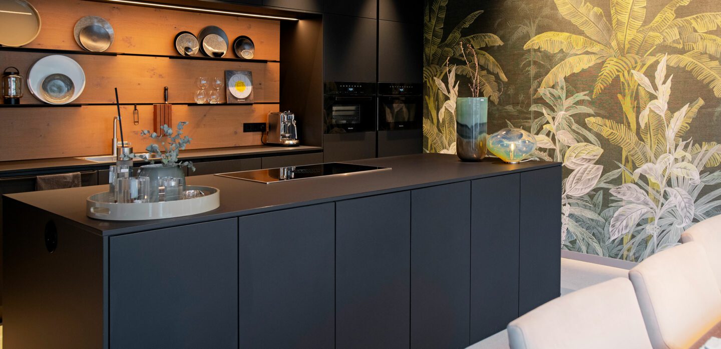 Ausstellungsküche für Design-Liebhaber in Insel-Form mit Mattlack-Fronten Schwarz. Weitere Bestandteile dieser Küche sind: