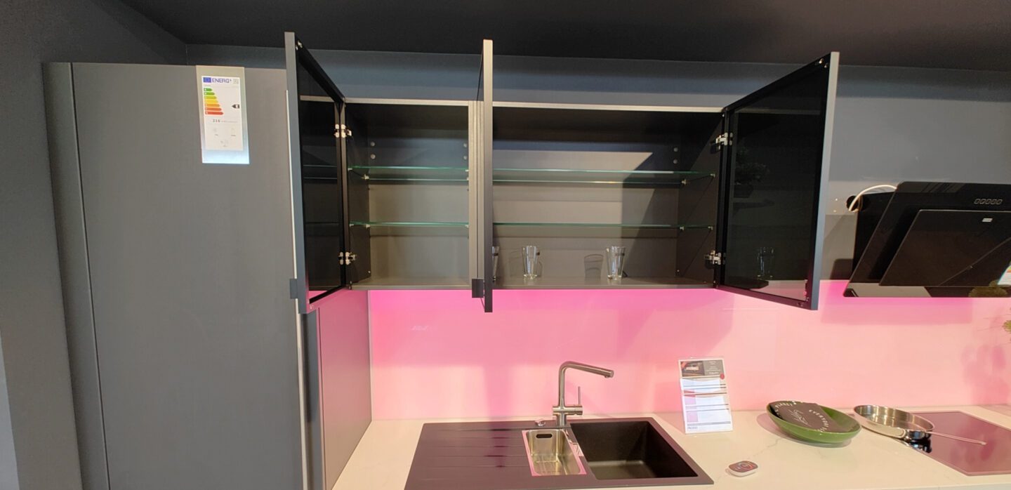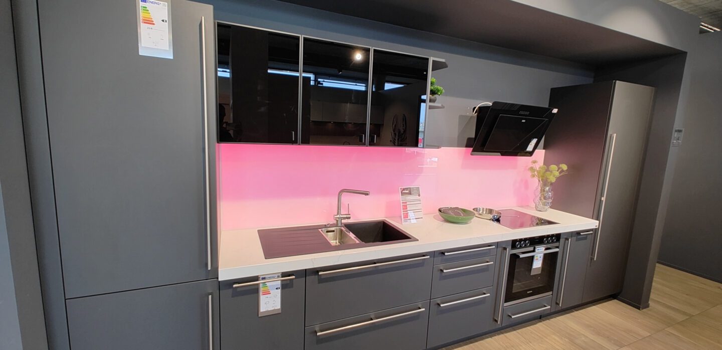 Einzeilige Küche mit Organic Glas-Fronten in Grau, Elementstein-Arbeitsplatte in Marmor-Optik und einer Nischenrückwand mit wechselbarer LED-Beleuchtung.