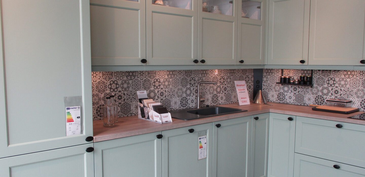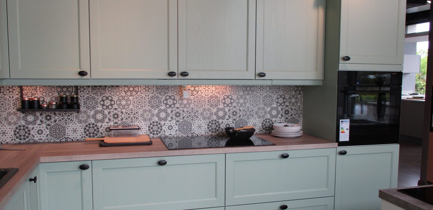 Ausstellungsküche in L-Form mit Echtholz-Fronten in Esche pastellgrün sowie Schichtstoff-Arbeitsplatte in Eiche Venezia Repro und Nischenrückwand in Marakesch grau. Weitere Bestandteile dieser Küche sind: