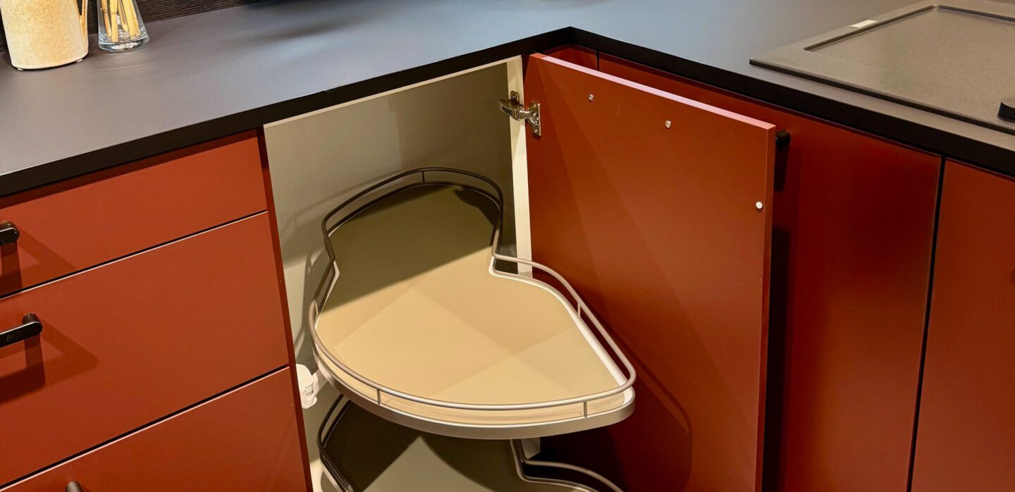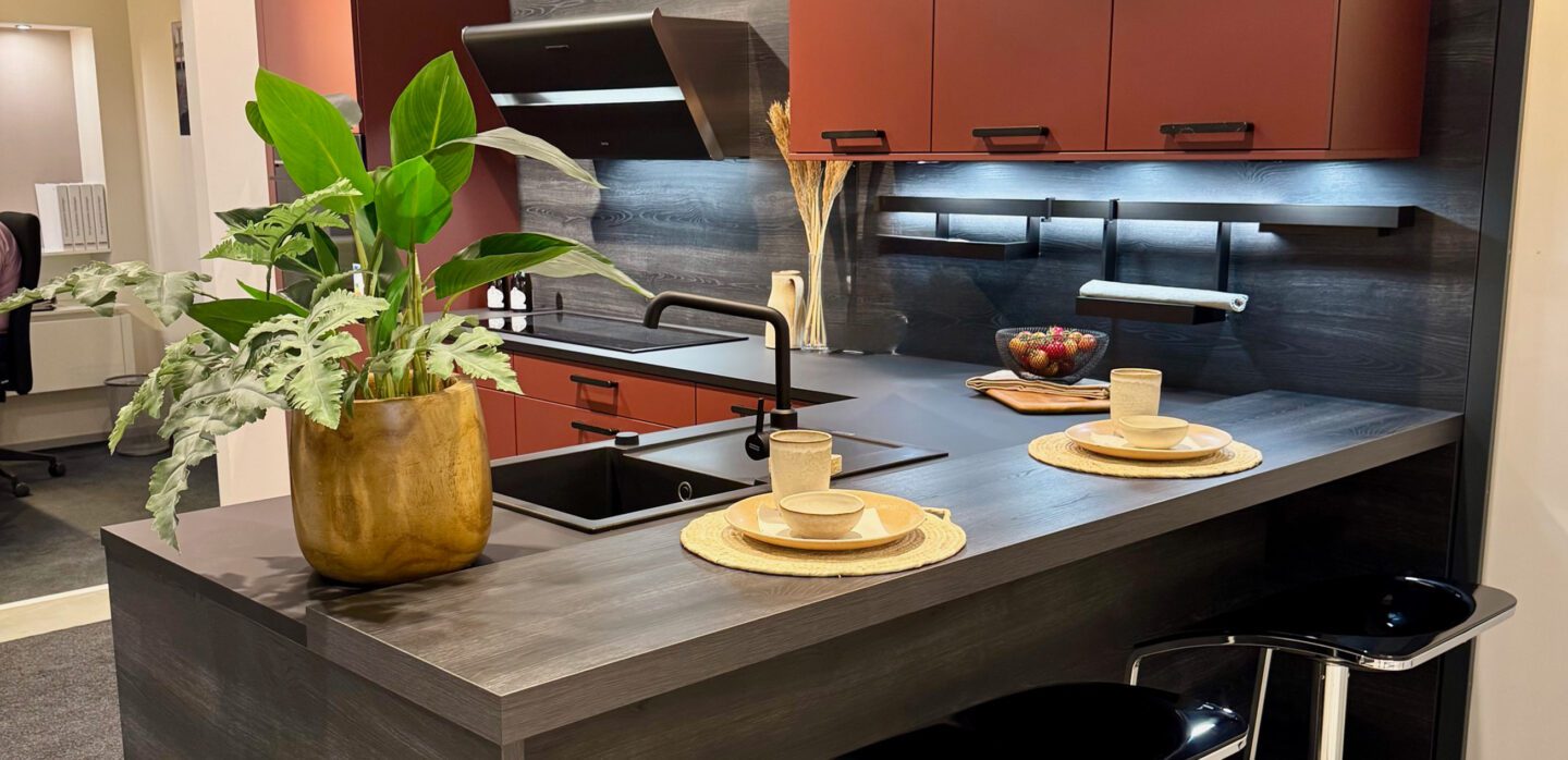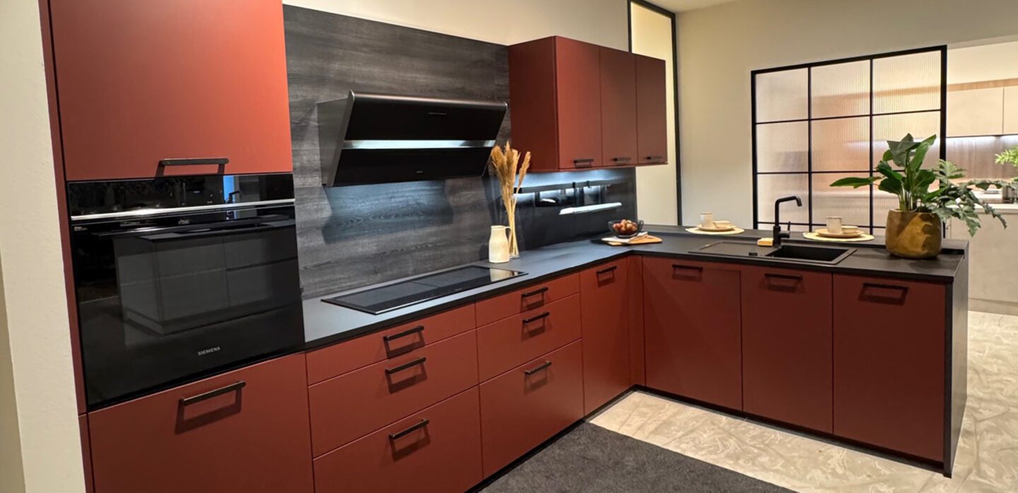 Dunkle L-Küche mit Mattlack-Fronten in Kaminrot und Hemlock Lava und Schichtstoff-Arbeitsplatte.