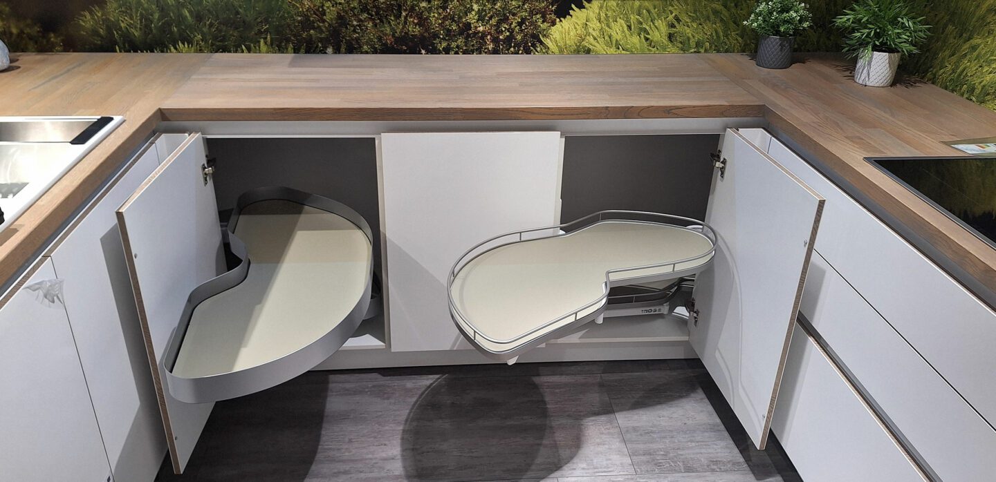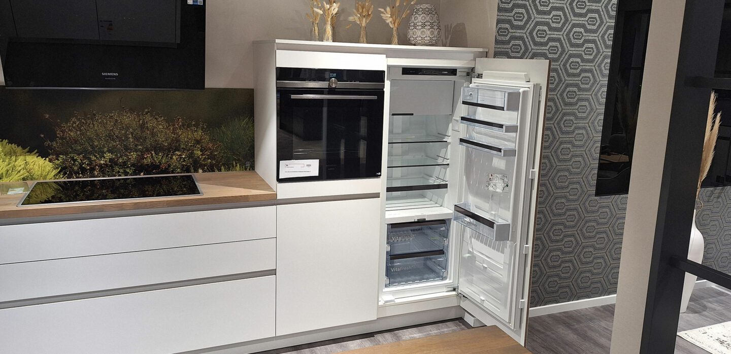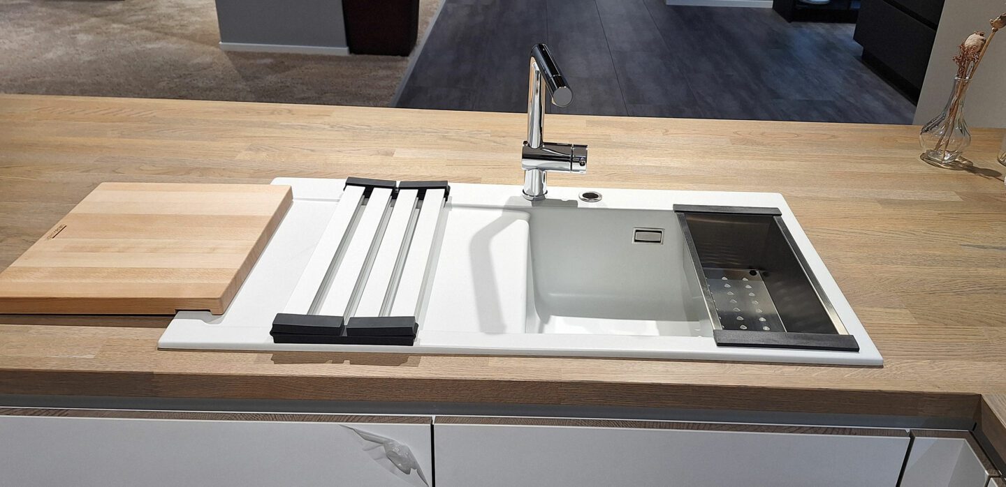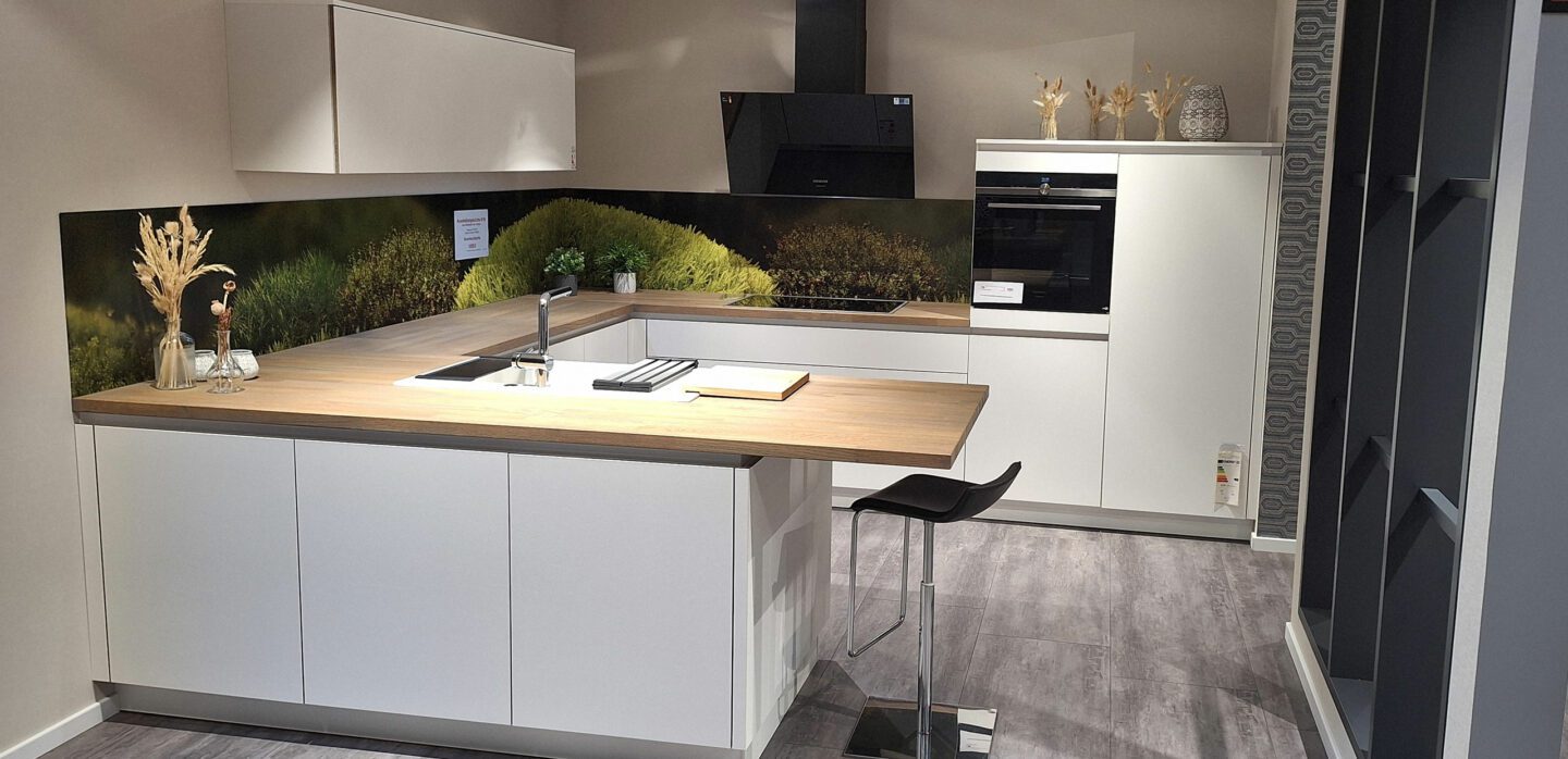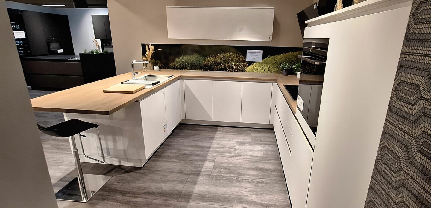 Geräumige Ausstellungsküche in U-Form mit weißer Mattlack-Front und massiver Arbeitsplatte in Eiche. Weitere Bestandteile dieser Küche sind: