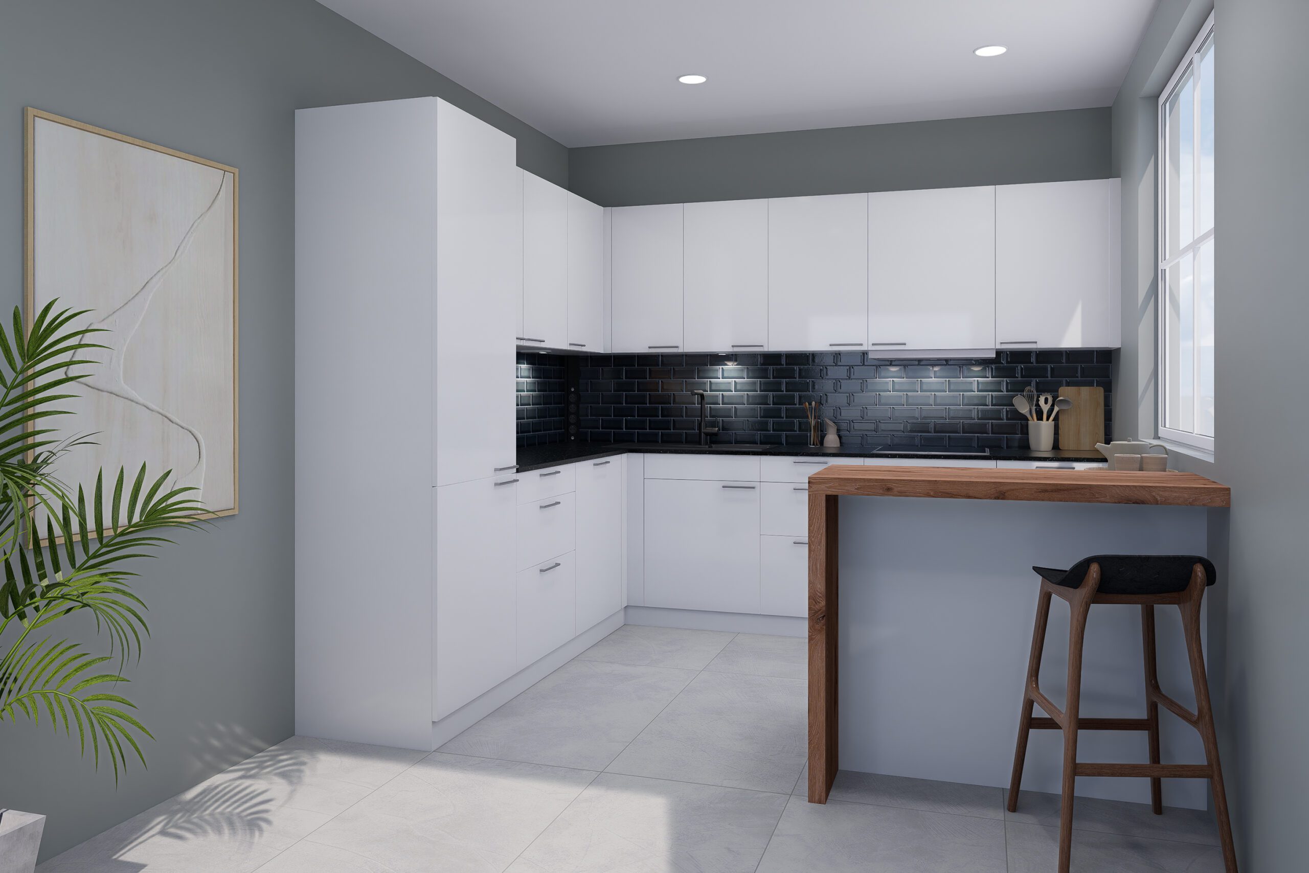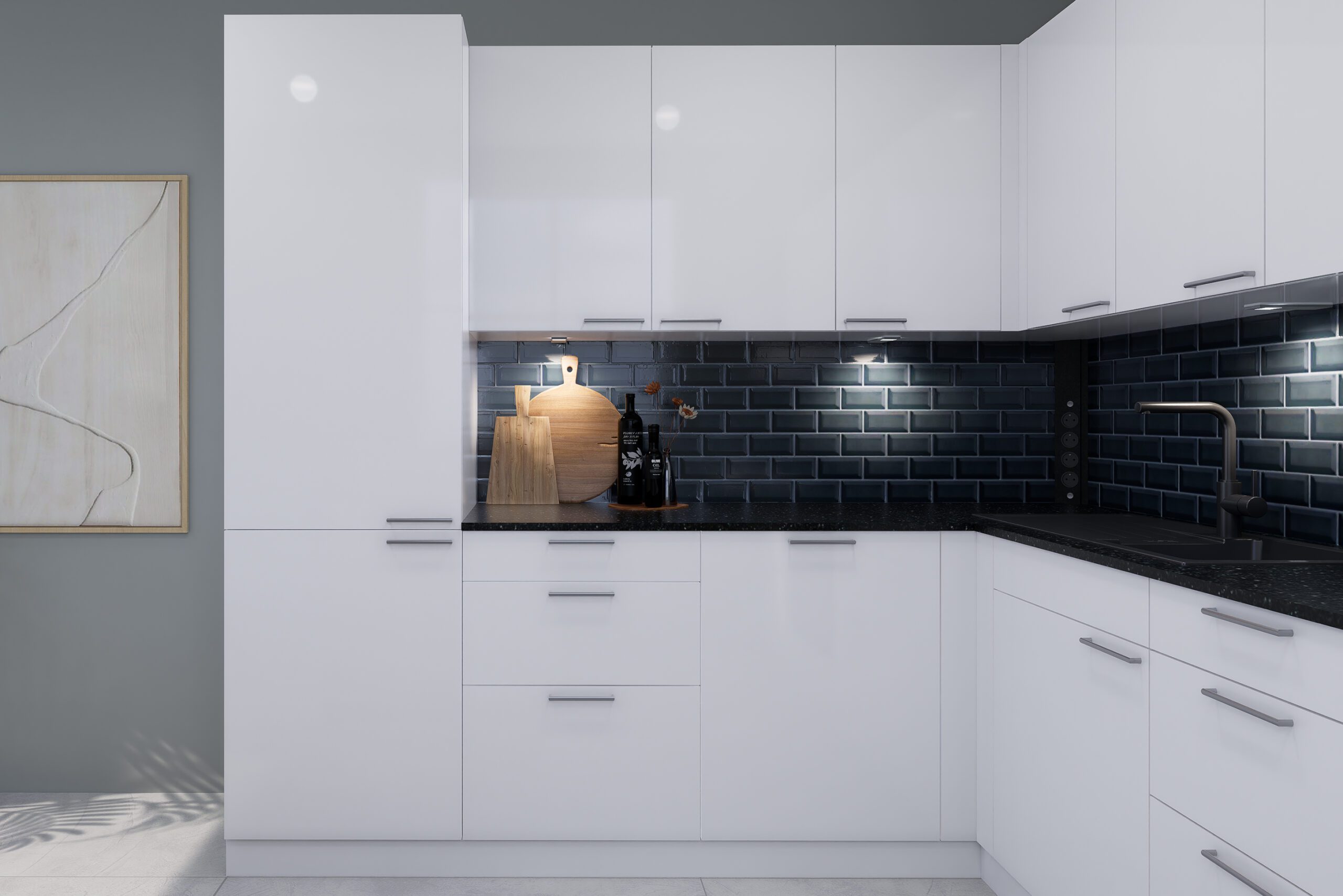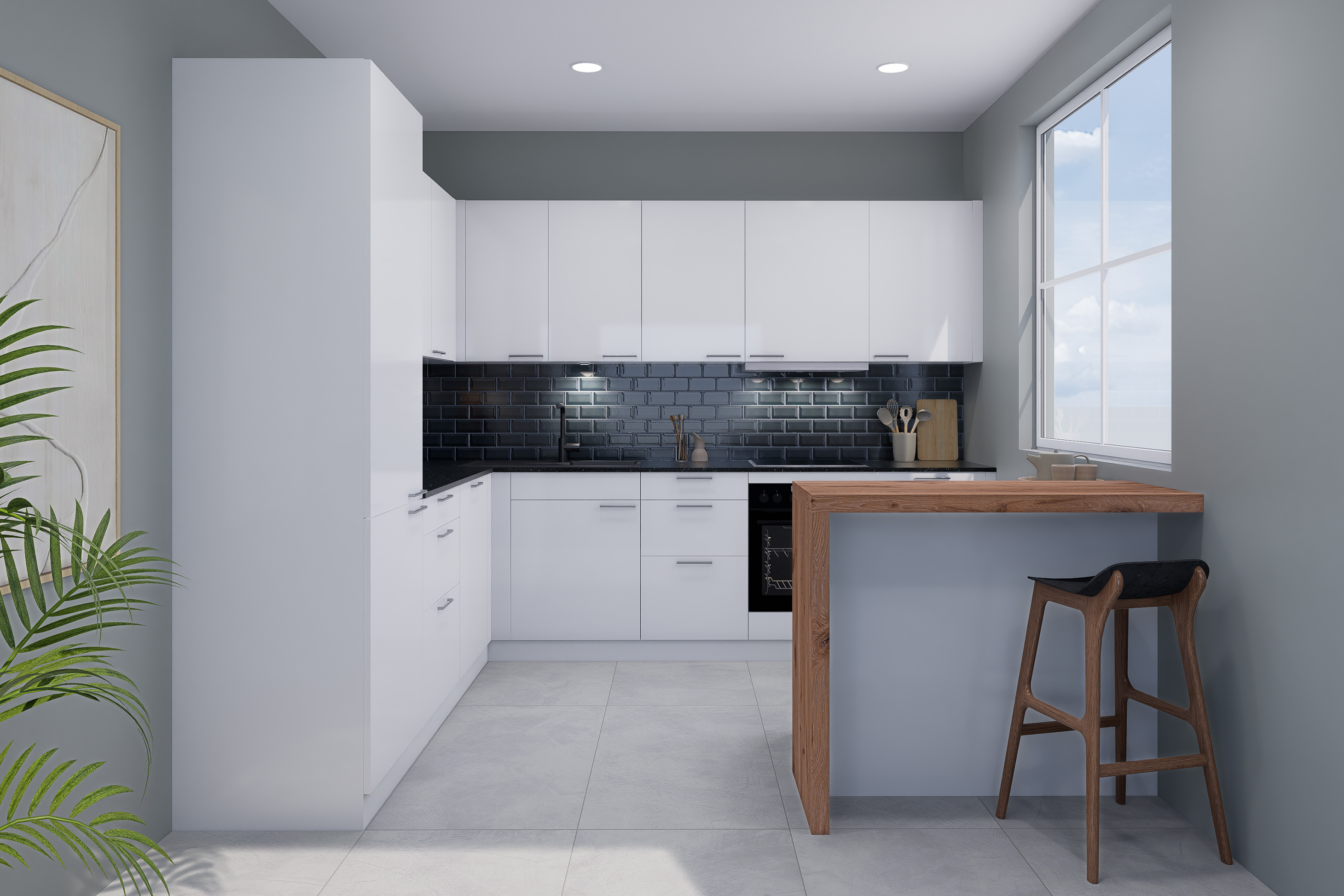 Die Materialien der Küche vereinen zeitlose Eleganz mit funktionaler Schönheit. Die UV-Mattlack-Front in Kristallweiß wirkt leicht, modern und pflegeleicht, während die Anti-Fingerprint-Oberfläche für eine angenehme Haptik sorgt. Die Naturstein-Arbeitsplatte Winning Black beeindruckt mit tiefschwarzer Optik, feinen Schlieren und kristallinem Glanz und verleiht der Küche luxuriöse Tiefe. Die Theke aus Alpineiche Repro strahlt natürliche Wärme aus und wird zum einladenden Mittelpunkt der Küche. Abgerundet wird das Design durch die Nischenrückwand mit Motivdruck, die elegante Akzente setzt und pflegeleicht zugleich ist – eine Küche, die Stil, Funktion und Wohlfühlatmosphäre perfekt verbindet.