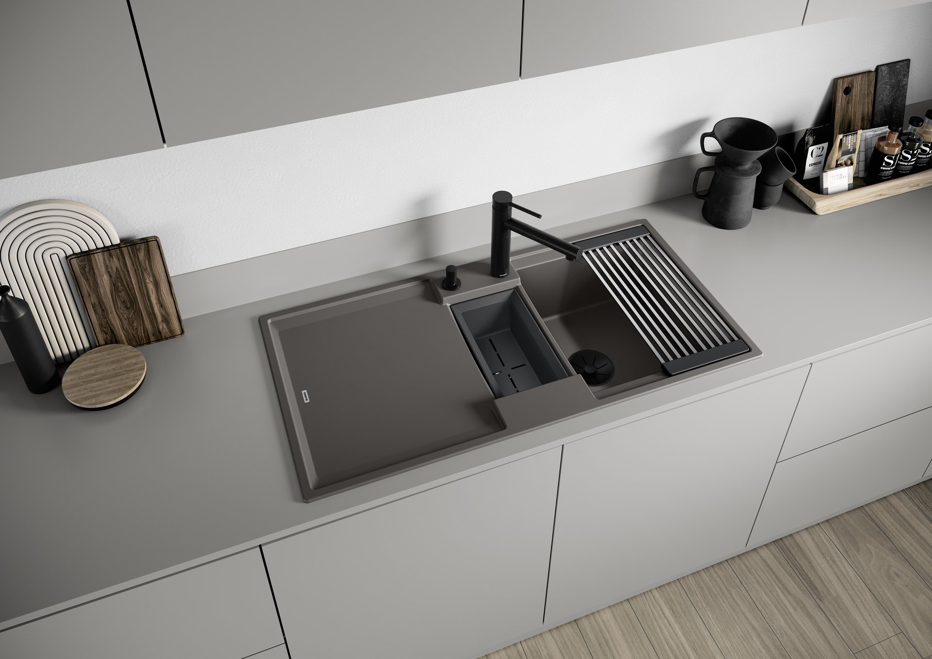 Die Einbauspüle überzeugt mit modernem Design und hoher Funktionalität. Gefertigt aus robustem Silgranit in Vulkangrau, ist sie besonders langlebig, kratzfest und pflegeleicht. Die reversible Bauweise ermöglicht eine flexible Planung ab 60-cm-Unterschränken.