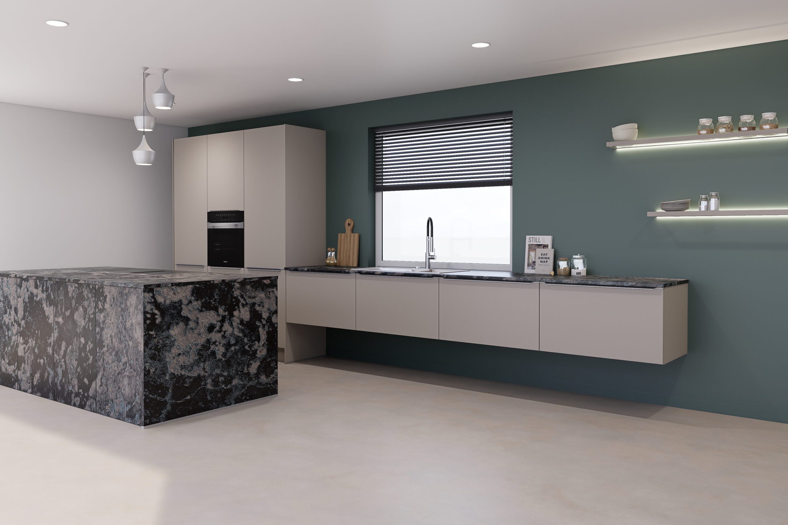 Natürliche Materialien, warme Farbtöne und ein offenes Raumgefühl mit moderner Funktionalität. Die markante Kochinsel in Monolith-Optik und schwebende Unterschränke schaffen ein besonders leichtes, elegantes Design.