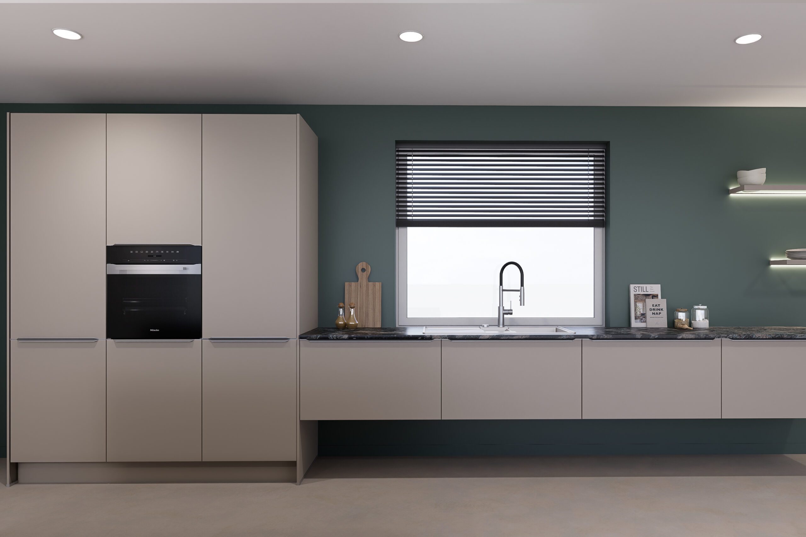 Die Küche „NatureLight“ ist mit hochwertigen Einbaugeräten von Miele ausgestattet, die innovative Technik, Komfort und Effizienz perfekt vereinen. Der Backofen überzeugt mit 76 Litern Garraum, DirectSensor S Touchbedienung und praktischen Automatikprogrammen für perfekte Ergebnisse beim Backen und Braten. Das Induktionskochfeld mit integriertem Lüfter kombiniert leistungsstarkes Kochen mit besonders leisem Betrieb. Dank Con@ctivity passt sich der Dunstabzug automatisch dem Kochvorgang an. Der Geschirrspüler sorgt mit QuickPowerWash für gründlich sauberes Geschirr in weniger als einer Stunde und bietet mit flexiblen Comfort-Körben hohen Bedienkomfort. Die Kühl-Gefrier-Kombination rundet die Ausstattung ab und hält Lebensmittel dank DailyFresh-Schublade, LED-Beleuchtung und SuperCool besonders lange frisch. So verbindet die Einbauküche modernste Gerätetechnik, Effizienz und Komfort – für ein Kocherlebnis auf höchstem Niveau.