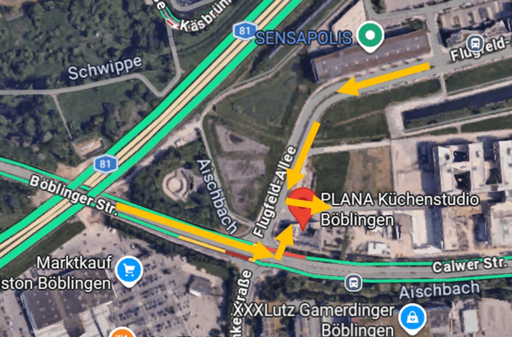 Unser Küchenstudio ist selbstverständlich weiterhin wie gewohnt für Sie geöffnet und bequem erreichbar – die Zufahrt erfolgt über die Flugfeld-Allee oder die Böblinger Straße.